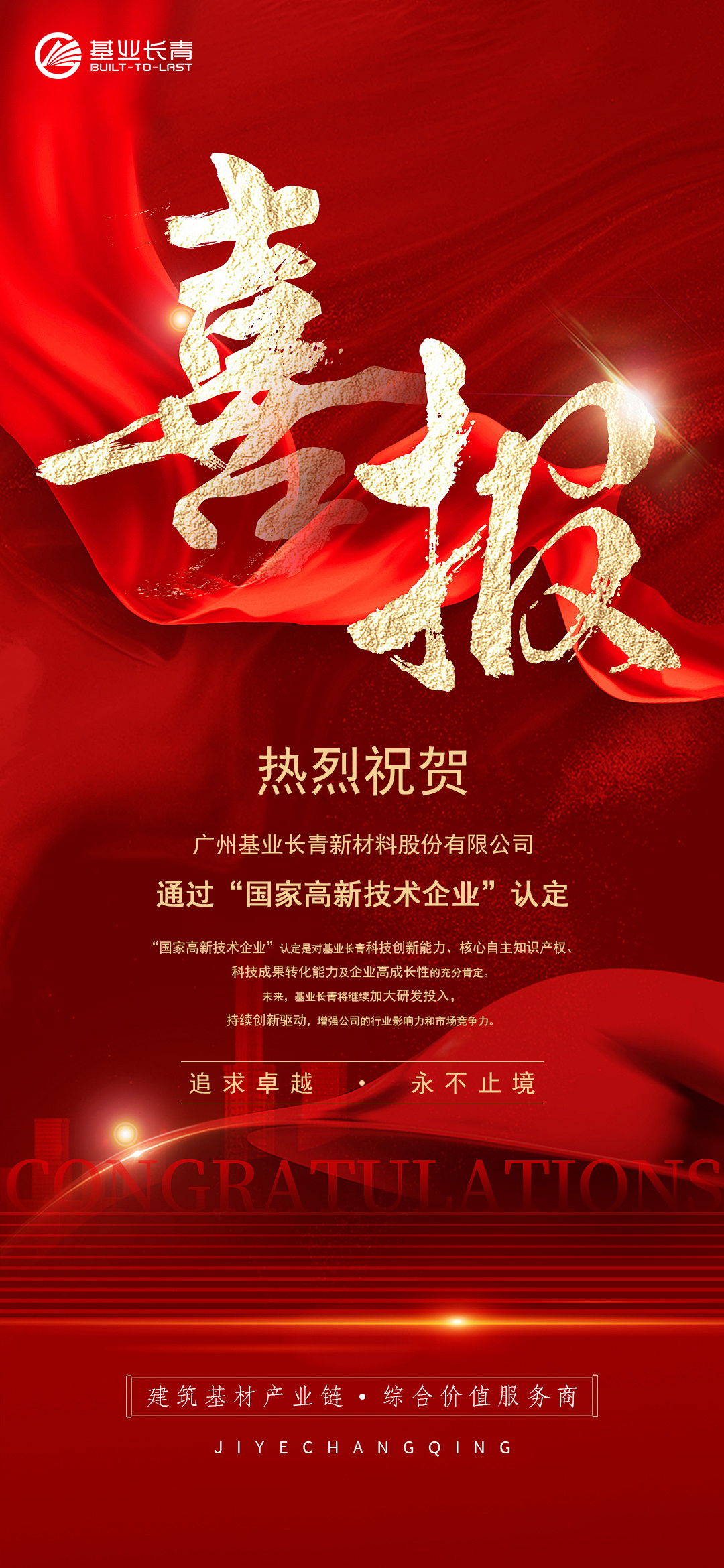 “國家高新技術企業”認定是對基業長青科技創新能力、核心自主知識產權、科技成果轉化能力及企業高成長性的充分肯定。未來,基業長青將繼續加大研發投入,持續創新驅動,增強公司的行業影響力和市場競爭力。