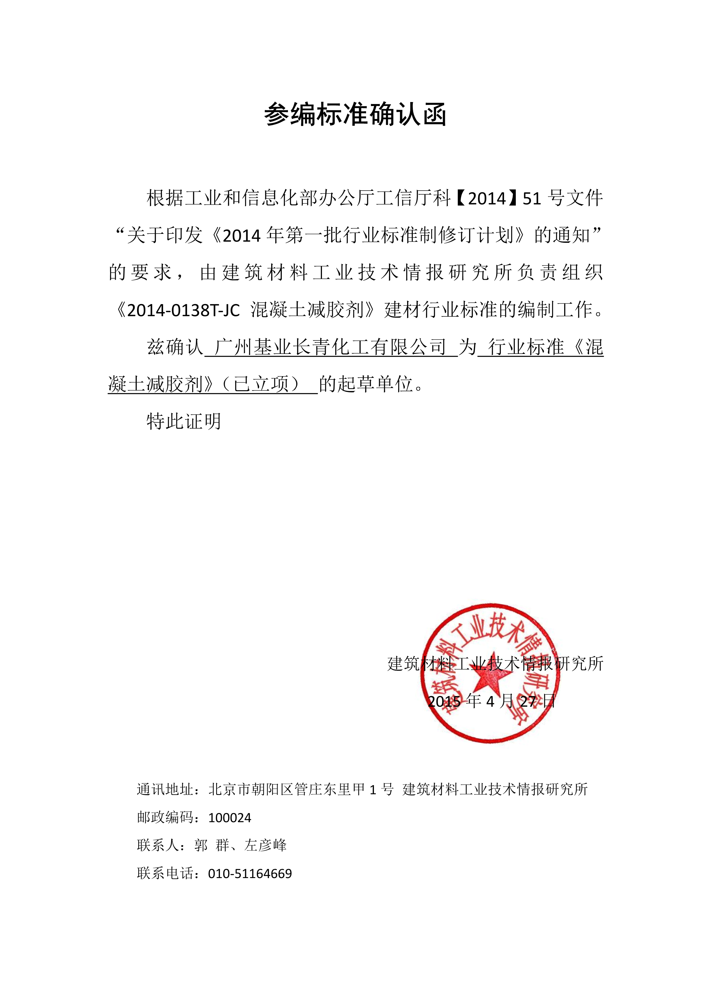 為進一步規范市場行為,促進行業發展,根據2014年工業和信息化部辦公廳《關于印發2014年第一批行業標準制修訂計劃的通知》文件的要求,由建筑材料工業技術情報研究所負責《混凝土減膠劑》行業標準的編制工作,標準歸口中國建筑材料聯合會。