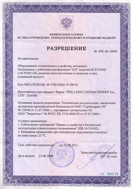 Разрешение Ростехнадзора 英文:RosTechNadzor(RTN)又叫RTN認證,中文:俄羅斯RTN工業(yè)設(shè)備安裝使用許可證,RTN證書,RTN許可證,安裝使用許可證等。是由俄羅斯生態(tài)、技術(shù)和原子能監(jiān)督局簽發(fā)危險設(shè)備產(chǎn)品的安裝使用技術(shù)許可證書。